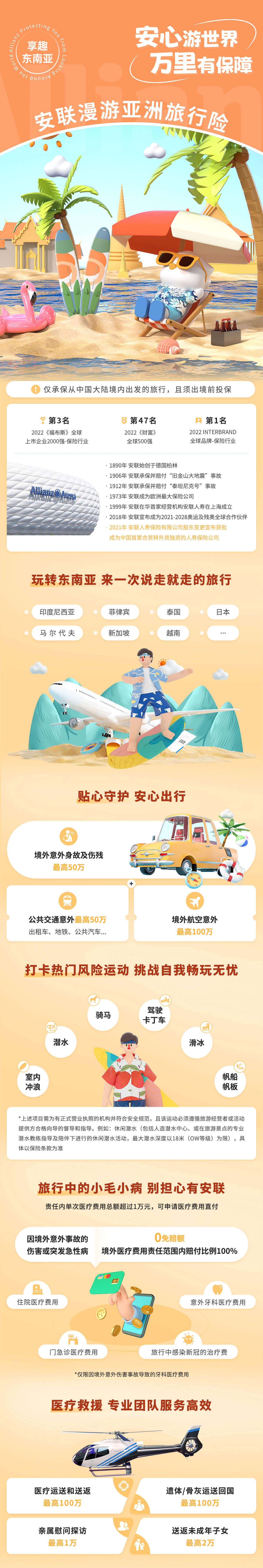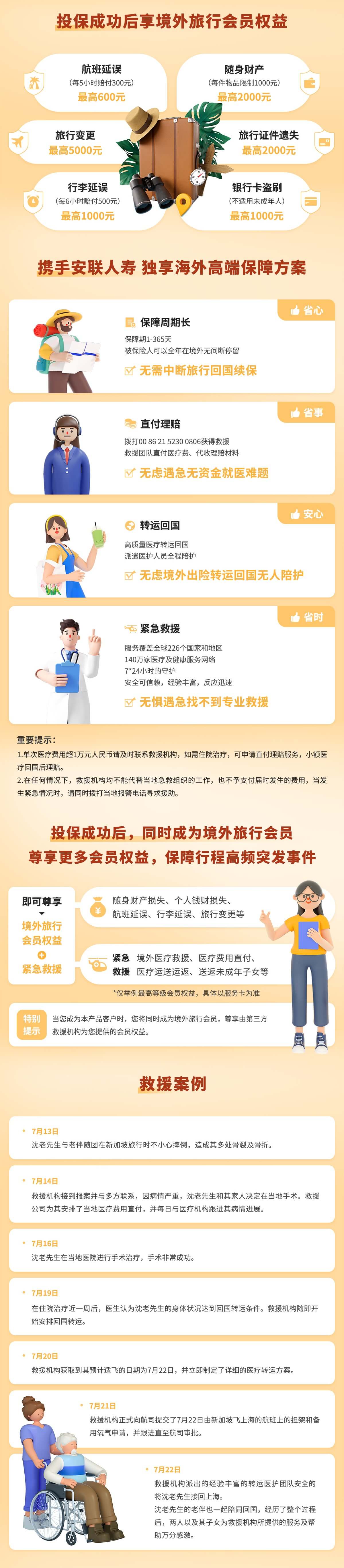 3.产品说明:本产品为安联境外旅行(畅游版)互联网意外伤害保险(条款文字编码:安联人寿[2023]意外伤害保险048号),通过互联网销售并由安联人寿保险有限公司进行承保。本产品的必选责任为境外意外身故及伤残保险金、境外医疗保险金、境外紧急医疗救援-医疗运送和送返/遗体或骨灰送返费/亲属慰问探访费,其余为我们推荐您购买的可选责任,如您需有其他保险需求请联系在线客服。