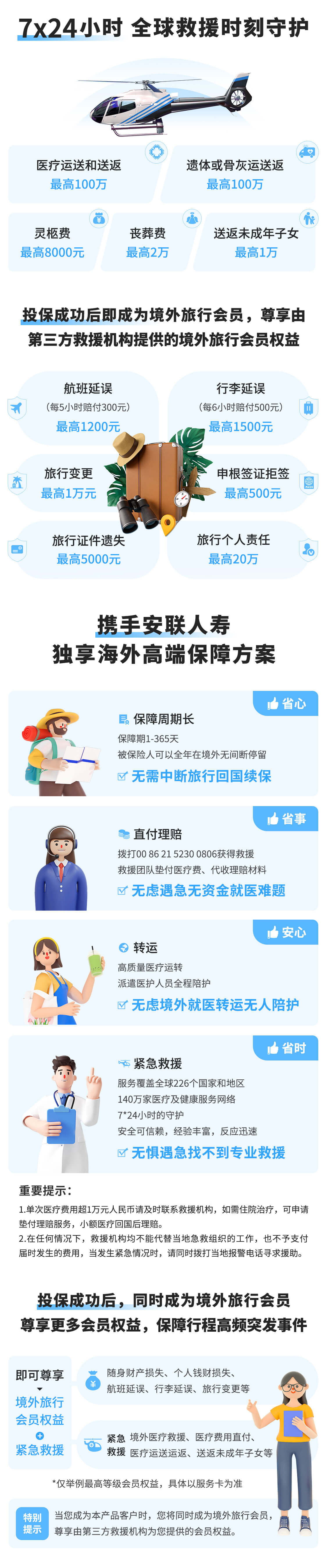 3.产品说明:本产品为安联境外旅行(畅游版)互联网意外伤害保险(条款文字编码:安联人寿[2023]意外伤害保险048号),通过互联网销售并由安联人寿保险有限公司进行承保。本产品的必选责任为境外意外身故及伤残保险金、境外医疗保险金、境外紧急医疗救援-医疗运送和送返/遗体或骨灰送返费/亲属慰问探访费,其余为我们推荐您购买的可选责任,如您需有其他保险需求请联系在线客服。