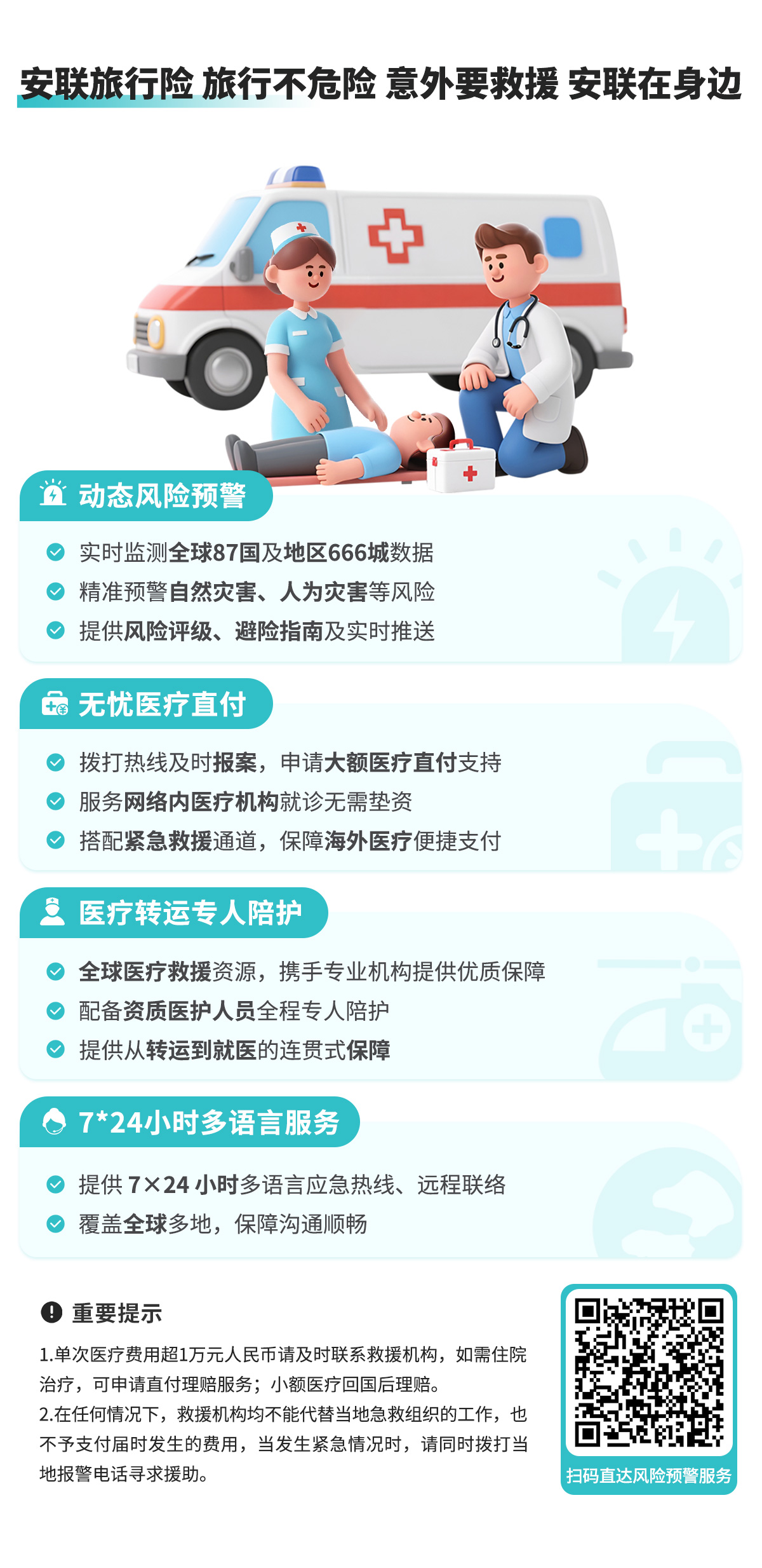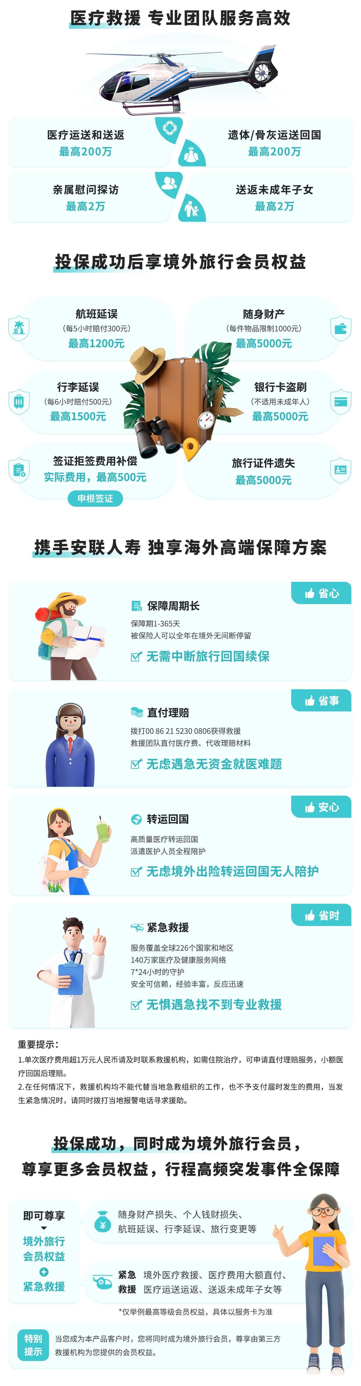 3.产品说明:本产品为安联境外旅行(畅游版)互联网意外伤害保险(条款文字编码:安联人寿[2023]意外伤害保险048号),通过互联网销售并由安联人寿保险有限公司进行承保。本产品的必选责任为境外意外身故及伤残保险金、境外医疗保险金、境外紧急医疗救援-医疗运送和送返/遗体或骨灰送返费/亲属慰问探访费,其余为我们推荐您购买的可选责任,如您需有其他保险需求请联系在线客服。